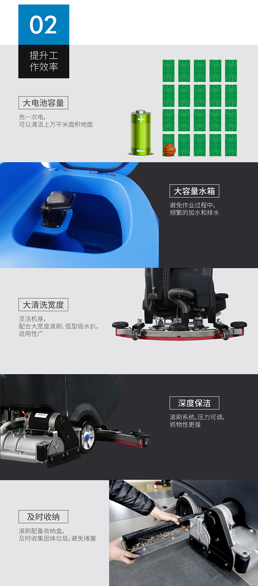 用途:洗掃一體機(jī)是集洗地掃地功能于一體的二合一機(jī)型,洗地效率達(dá)3150㎡/h。