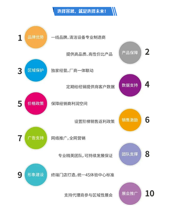 區(qū)域獨家經(jīng)營,支持合作伙伴打造容恩清潔設(shè)備4s服務(wù)體驗中心,統(tǒng)一品牌形象,打造集展示、體驗、會議、培訓(xùn)、售后、辦公等多功能的服務(wù)綜合體,逐步建立全國統(tǒng)一、標(biāo)準(zhǔn)化、專業(yè)化的4s門店。