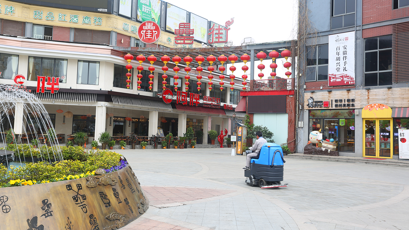 除了商家的自身保潔,大面積的公共地面衛(wèi)生,離不開高效便捷的清潔方式。容恩根據(jù)罍街的整體布局和地面類型,提供了專業(yè)的地面清潔方案——容恩洗掃一體機(jī)。